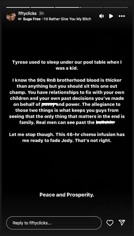 “The allegiance to those two things is what keeps you guys from seeing that the only thing that matters in the end is family. Real men can see past the bulls—. Let me stop though. This 46-hr chemo infusion has me ready to fade Jody,” he added, referencing the actor’s role in Baby Boy and announcing he’s undergoing chemotherapy for his current cancer diagnosis.